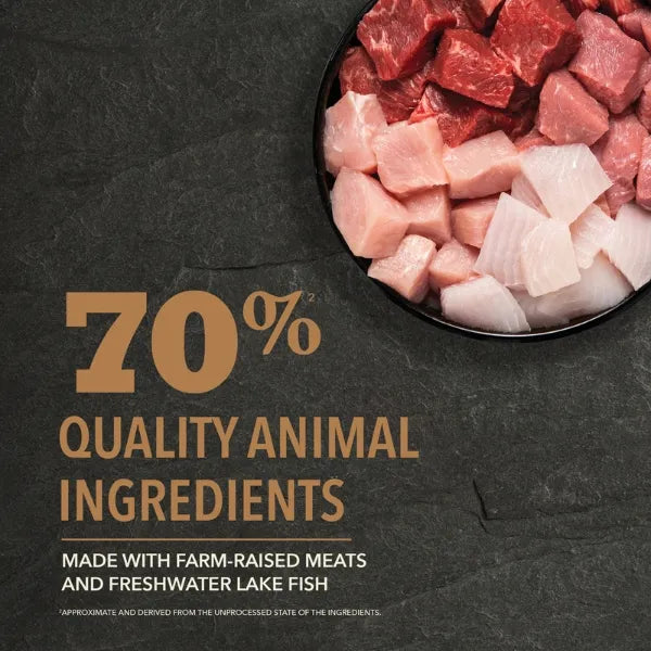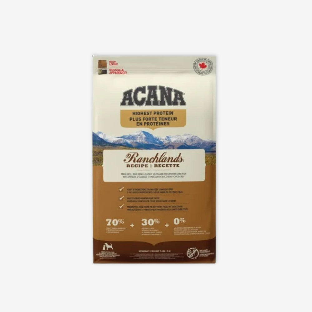 ACANA Highest Protein Ranchlands Recipe Dog Food is perfect for satisfying your dog with even more of the animal protein they crave. The Ranchlands Recipe is crafted with 70% quality animal ingredients* like farm-raised beef, pork, lamb, freshwater lake fish and bison balanced with 30%** fruit and vegetables to help nurture your dog with flavour and animal protein. It also includes prebiotics and fibre to help support your dogs digestive health. And with no artificial colours, flavours or preservatives added in the kitchen, its a recipe you and your dog will both love. Nurture your dog with protein-rich, nutritious, and delicious dog food to help them live a healthy, happy life.