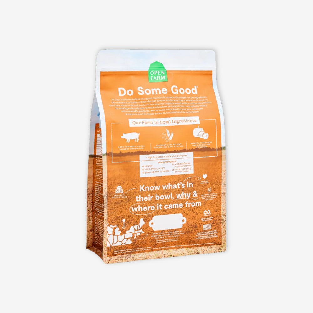 Bring a wholesome blend of nutrient-dense ancient grains to their bowl with this protein-packed complete and balanced meal, featuring humanely-raised pork, non-GMO fruits and veggies, and superfoods like pumpkin and quinoa. Free of peas, potatoes, and legumes, this 100% traceable recipe is formulated for optimal nutrition.