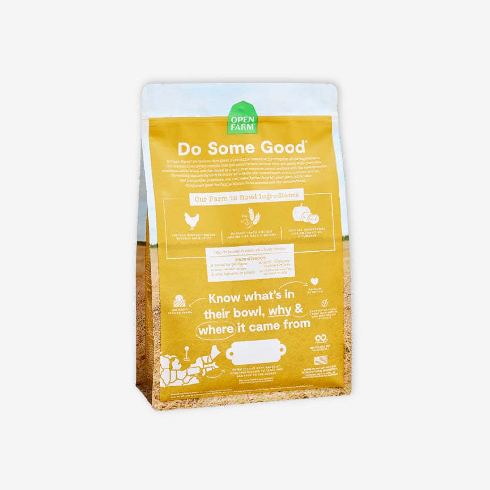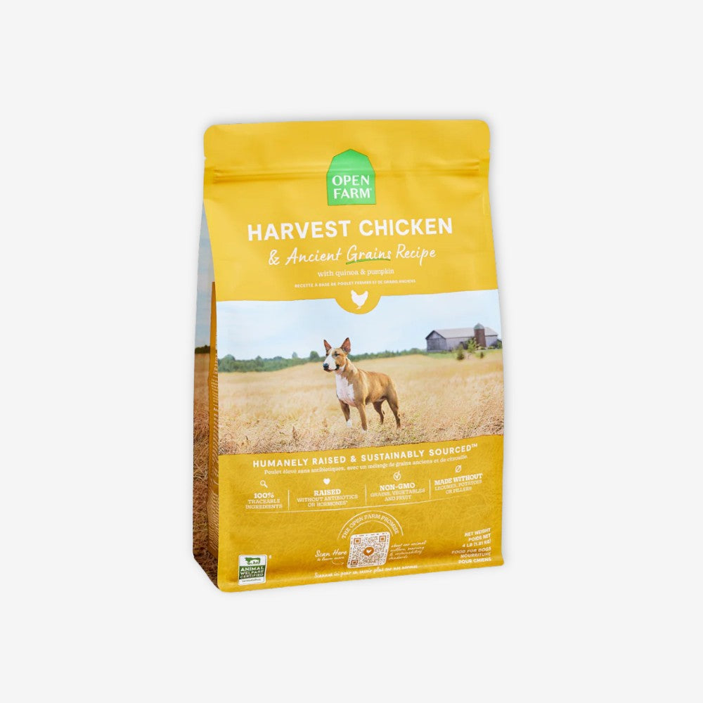 Open Farm Harvest Chicken & Ancient Grains Recipe Adult Dog Food is a hearty kibble that is a premium, nutrient-dense source of energy. This is thanks to a mix of humanely raised chicken, superfoods, and ancient grains to support your dog's overall health. Free of peas, potatoes, corn, wheat, soy, and legumes.