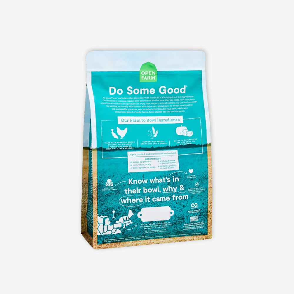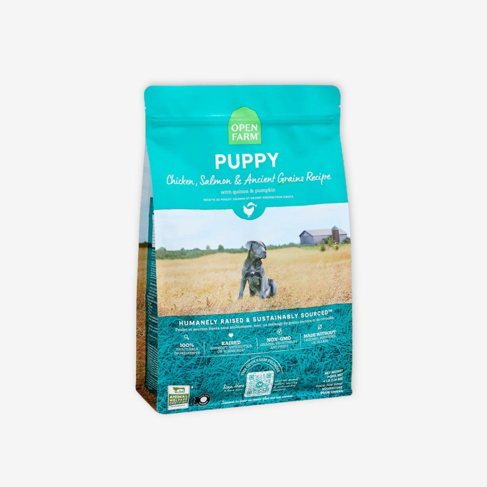 High protein for your high-energy pup. Open Farm Puppy Recipe with Ancient Grains is loaded with humanely raised chicken and pork, fresh Pacific wild-caught salmon, wholesome grains like steal-cut oats, millet, quinoa, and chia seeds and superfoods like coconut oil, pumpkin and turmeric. It's dry good-for-your-pup food made without peas, potatoes and legumes.