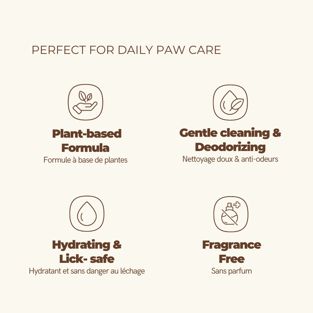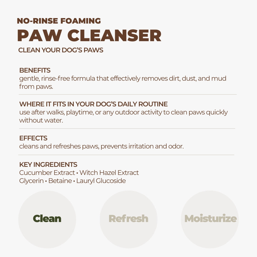 Simplify your pet’s grooming routine with our innovative Paw Cleansing Foam. Just pump, apply, and wipe — no rinsing required. Effectively removes dirt from hard-to-reach areas. Plant-based ingredients, including cucumber and witch hazel extracts, plus amino acid moisturizers, it gently cleanses while soothing and hydrating dry paws.