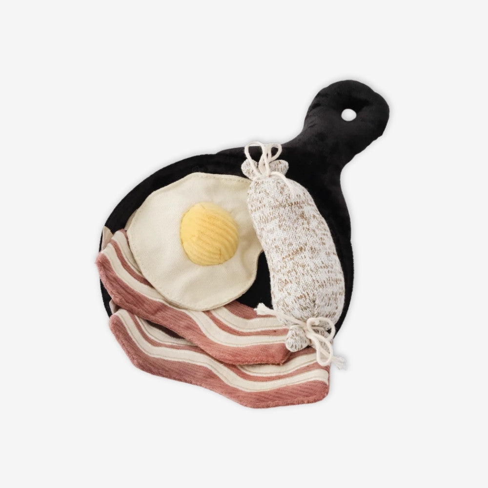Set contains sunny-side-up egg, two bacon strips, and a squeaky sausage