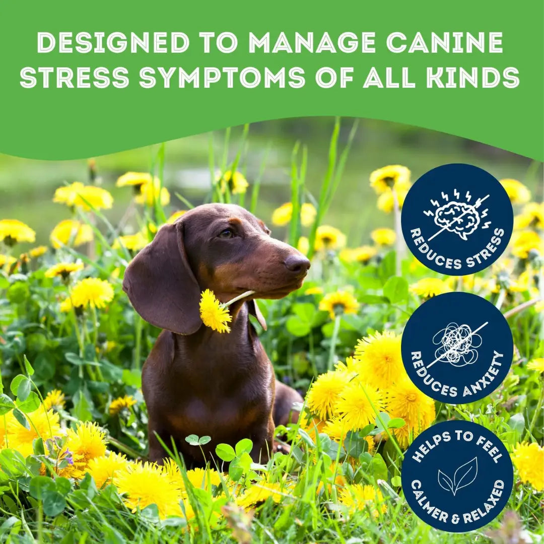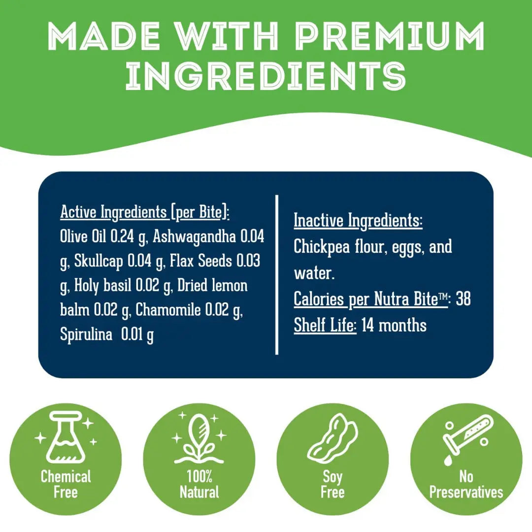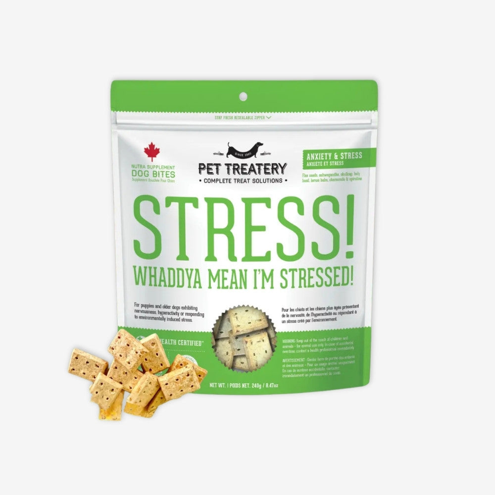 Stress & Anxiety Supplement Dog Bites offer a calming solution for dogs facing nervousness, hyperactivity, or stress from environmental changes. * Made with all Natural Ingredients * Hormone-free & antibiotic-free, Made in Canada * Vet Recommended * This supplement is only sold in Canada * 240g Pack These herbal bites are formulated to soothe anxious dogs and promote emotional balance, helping them handle stressful situations with ease. Our healthy herbal supplements are all natural, chemical- free and utilize the same plants and herbs your dog would seek in nature. Vet recommended for both puppies and senior dogs, these bites support relaxation and comfort, ensuring your furry friend stays calm and content. The natural ingredients work to ease nervousness and enhance overall emotional well-being, providing a gentle way to manage anxiety.