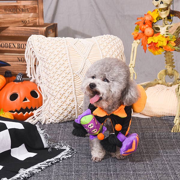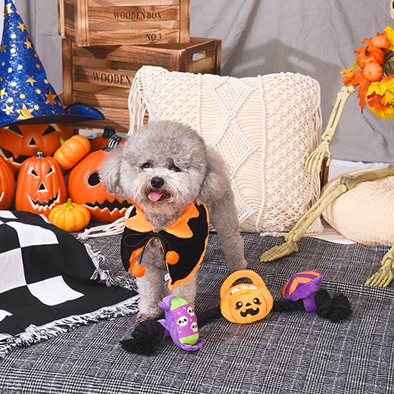 Trick-or-treat with our Howloween Candy dog toy! This toy features a candy basket and two candy toys on a sturdy rope, perfect for keeping your dog entertained. Each candy toy crinkles for added excitement, and there's a squeaker inside each one for satisfying sounds. Whether your dog enjoys tugging, fetching, or interactive play, this spooktacular rope toy is sure to be a howling hit during the Halloween season! Features: • The cotton rope goes through three plush toys for added excitement. • One squeaker in each toy keeps the dog active. • Perfect for a variety of interactive games. Dog Rope Toy Size: 19.7”x5.7”x2.4”