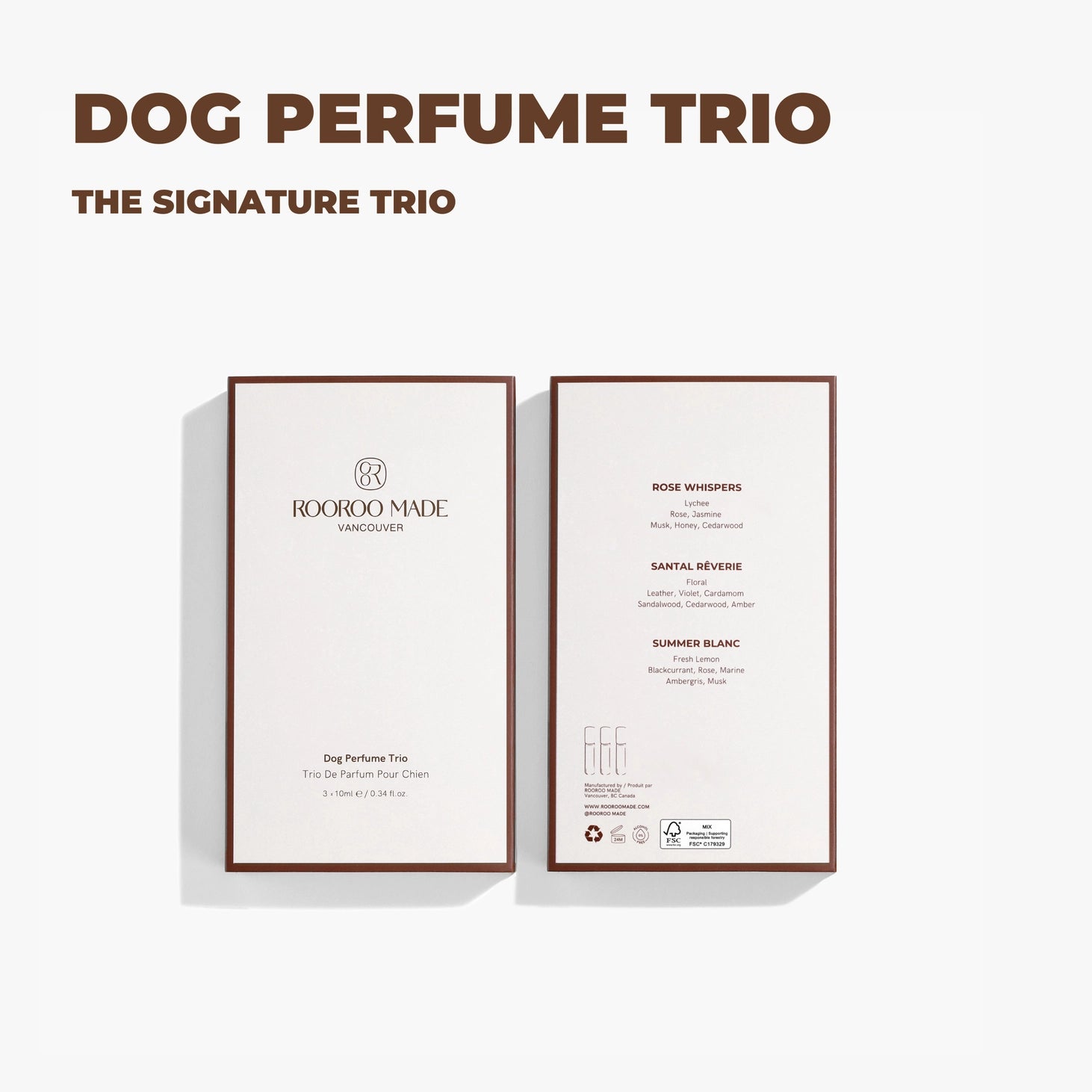 SANTAL RÊVERIE Top:Floral Heart:Leather, Violet, Cardamom Base:Sandalwood, Cedarwood, Amber SUMMER BLANC Top:Fresh Lemon Heart:Blackcurrant, Rose, Marine Base:Ambergris, Musk ROSE WHISPERS Top:Lychee Heart:Rose, Jasmine Base:Musk, Honey, Cedarwood Handmade with LOVE and QUALITY in Vancouver, Canada